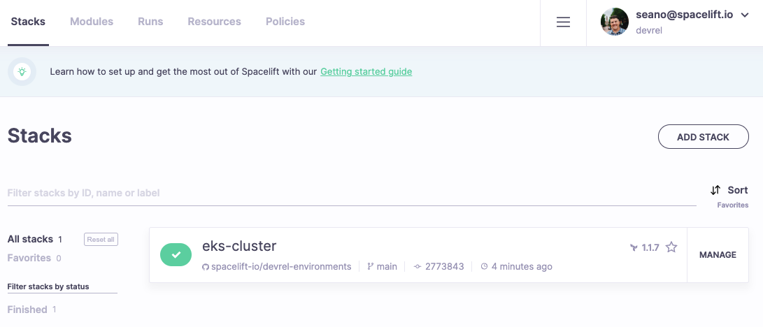 In Spacelift, go ahead and click the Add Stack button to create a Stack in Spacelift.