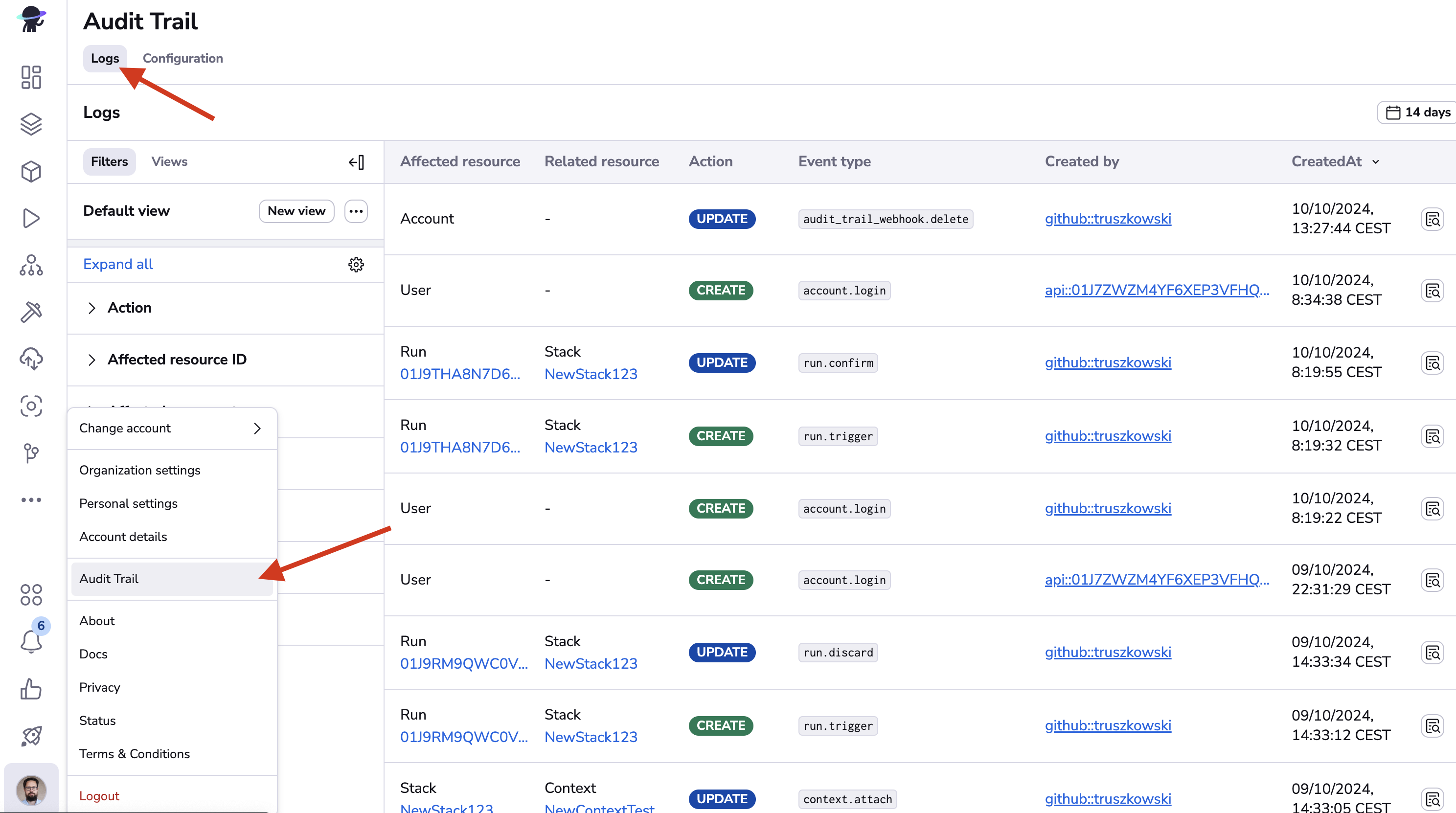 As an admin, you can view Audit trail logs by navigating to the Audit trail section of your account settings and choosing the logs tab:
