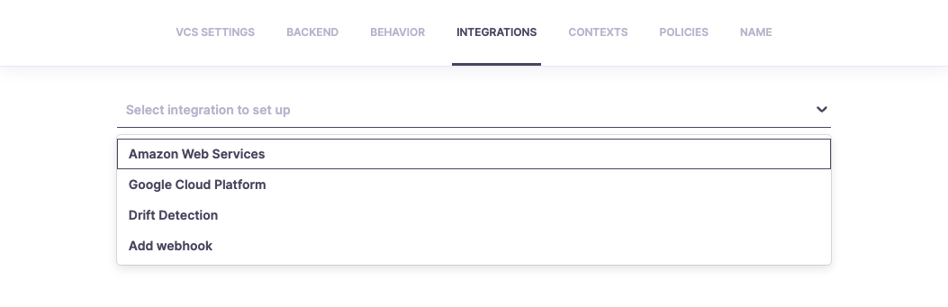 Navigate to the Settings, Integrations page and select the dropdown arrow to access the following selection screen: