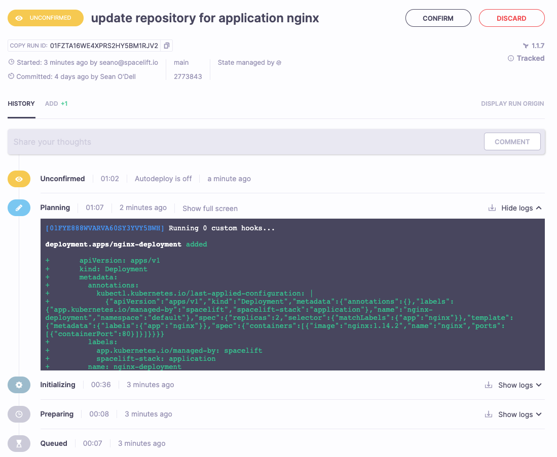 After you manually trigger the Run in the Stack view, Spacelift will deploy a runner image, initialize the Cloud Provider, Authenticate with the Kubernetes Cluster and run the Deployment specified in the repository.