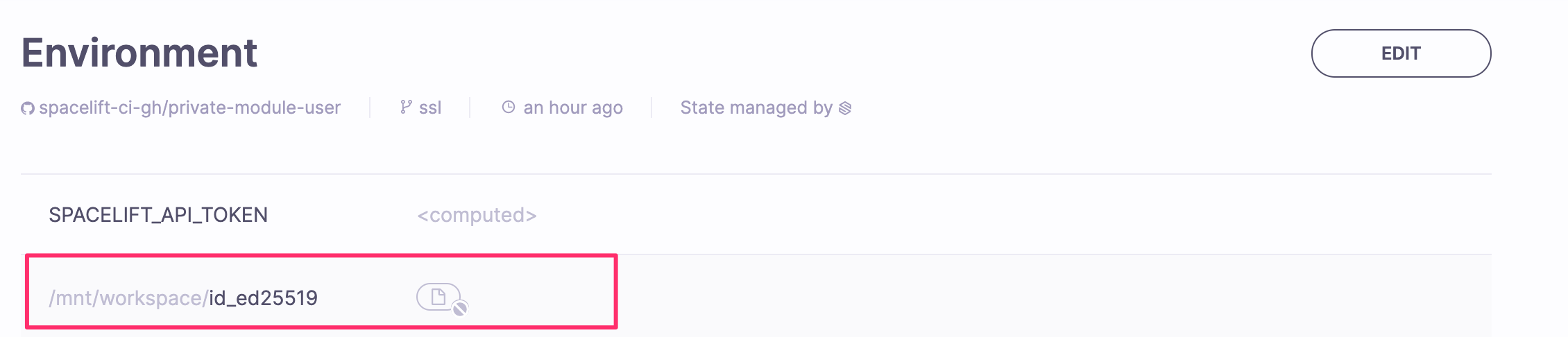 Using SSH isn't much more complex, but it requires a bit more preparation. Once you have a public-private key pair (whether it's a personal SSH key or a single-repo deploy key), you will need to pass it to Spacelift and make sure it's used to access your VCS provider. Once again, we're going to use the mounted file functionality to pass the private key called id_ed25519 to your stack's environment: