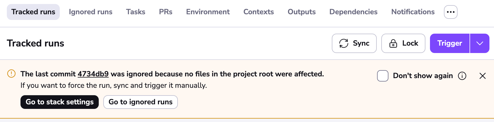 If you go to the main stack view where you can see the list of runs, a warning box will be shown in case your stack is not in sync. This warning will explain why the commit has been ignored.