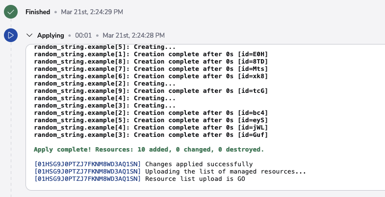 This preparation phase is very unlikely to fail, but if it does (eg. the worker node becomes unavailable during the transition), the run will transition to the terminal failed state. If the handover succeeds, or the run does not go through the manual approval process, the applying phase begins and attempts to deploy the changes. Here's an example: