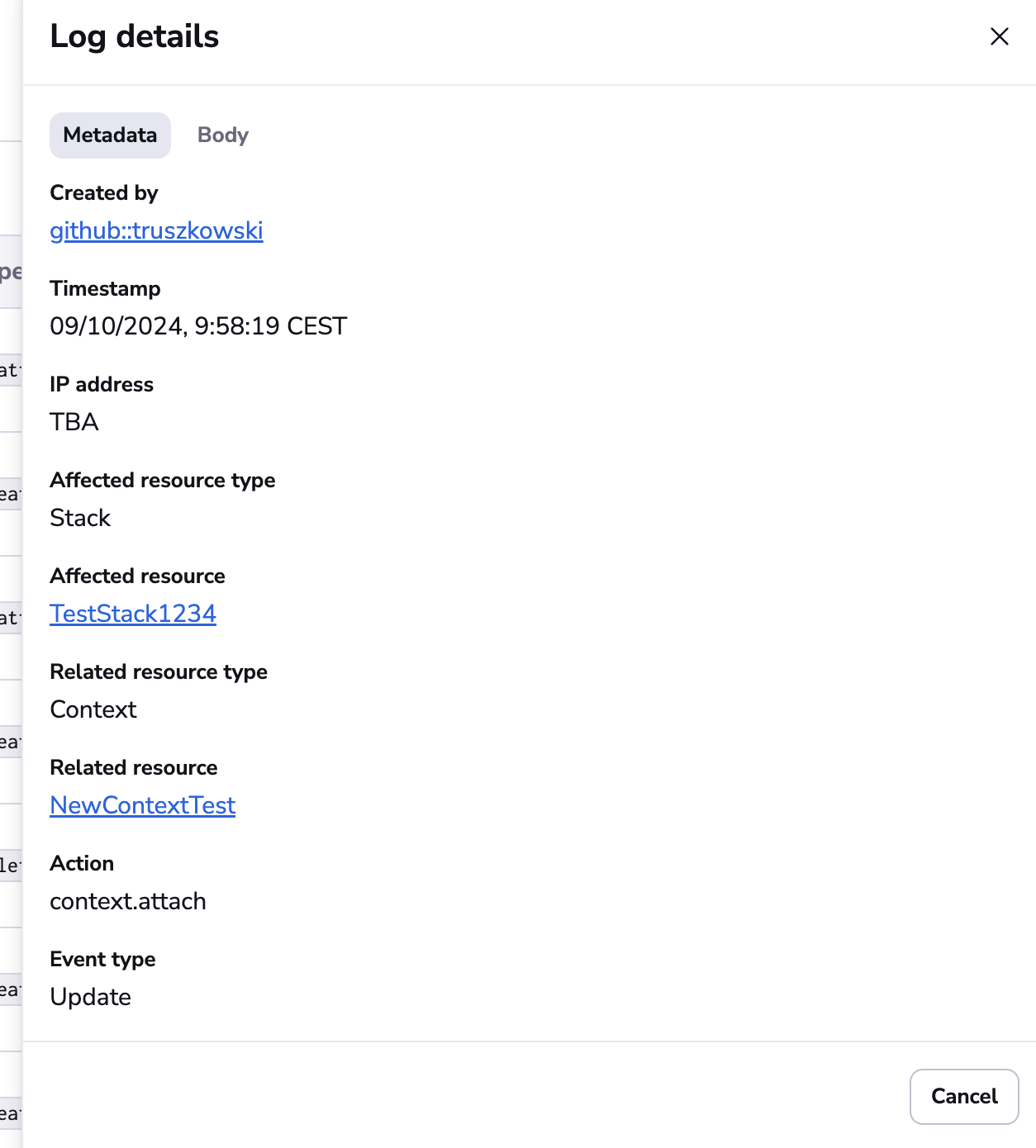 • actor_roles: (optional) array of role slugs attached to the actor when the action was performed. Only present when the actor has role attachments (e.g., stacks with role bindings);