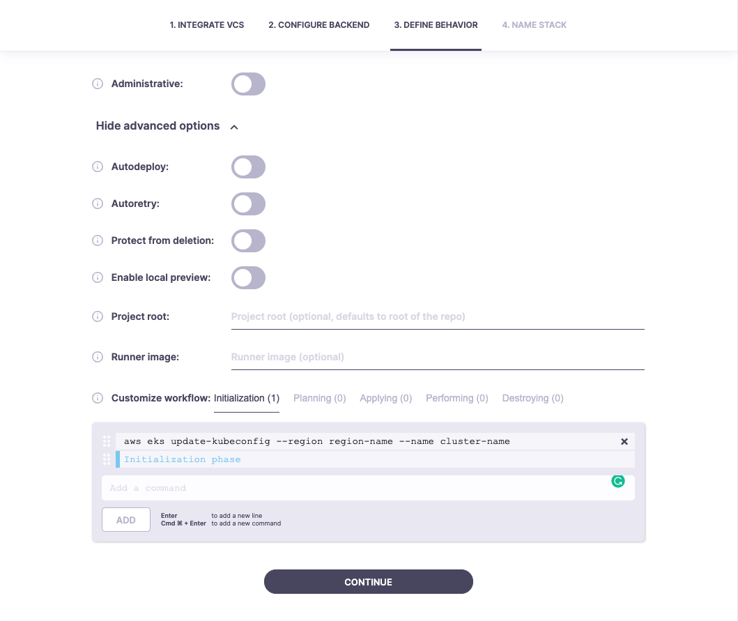 kubectlinstalled. - Customize workflow: During the initialization phase, you must specify the necessary command to ensure kubeconfig is updated and authenticated to the Kubernetes Cluster you will be authenticating against.