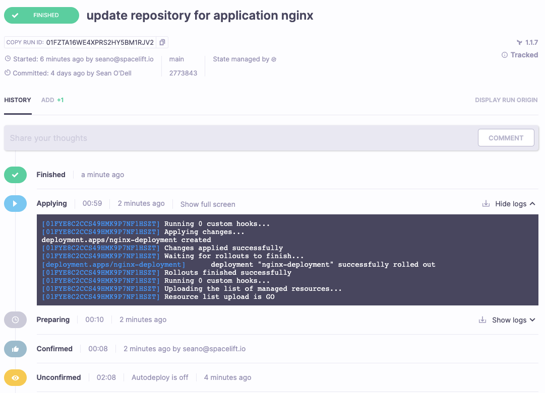 After you manually trigger the Run in the Stack view, Spacelift will deploy a runner image, initialize the Cloud Provider, Authenticate with the Kubernetes Cluster and run the Deployment specified in the repository.