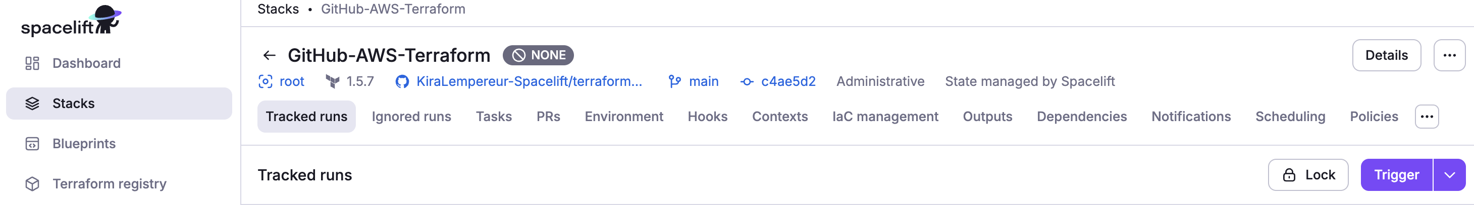 - Click Trigger to start a Spacelift run. This will check the source code and run any commands on it, and you will be taken to the run view.