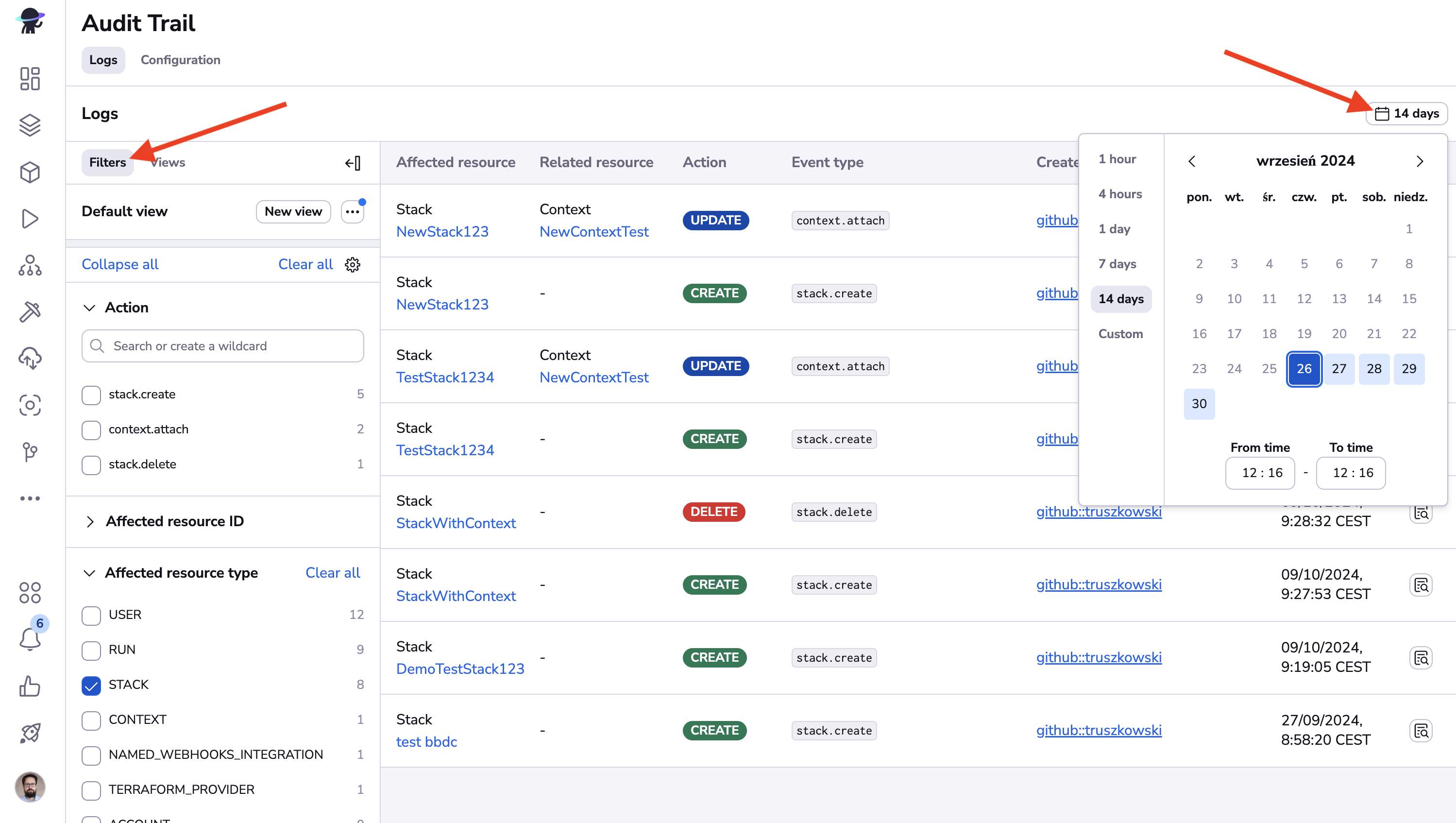 You can look for specific events using filters (on the left side) and the date picker (in the top-right corner).