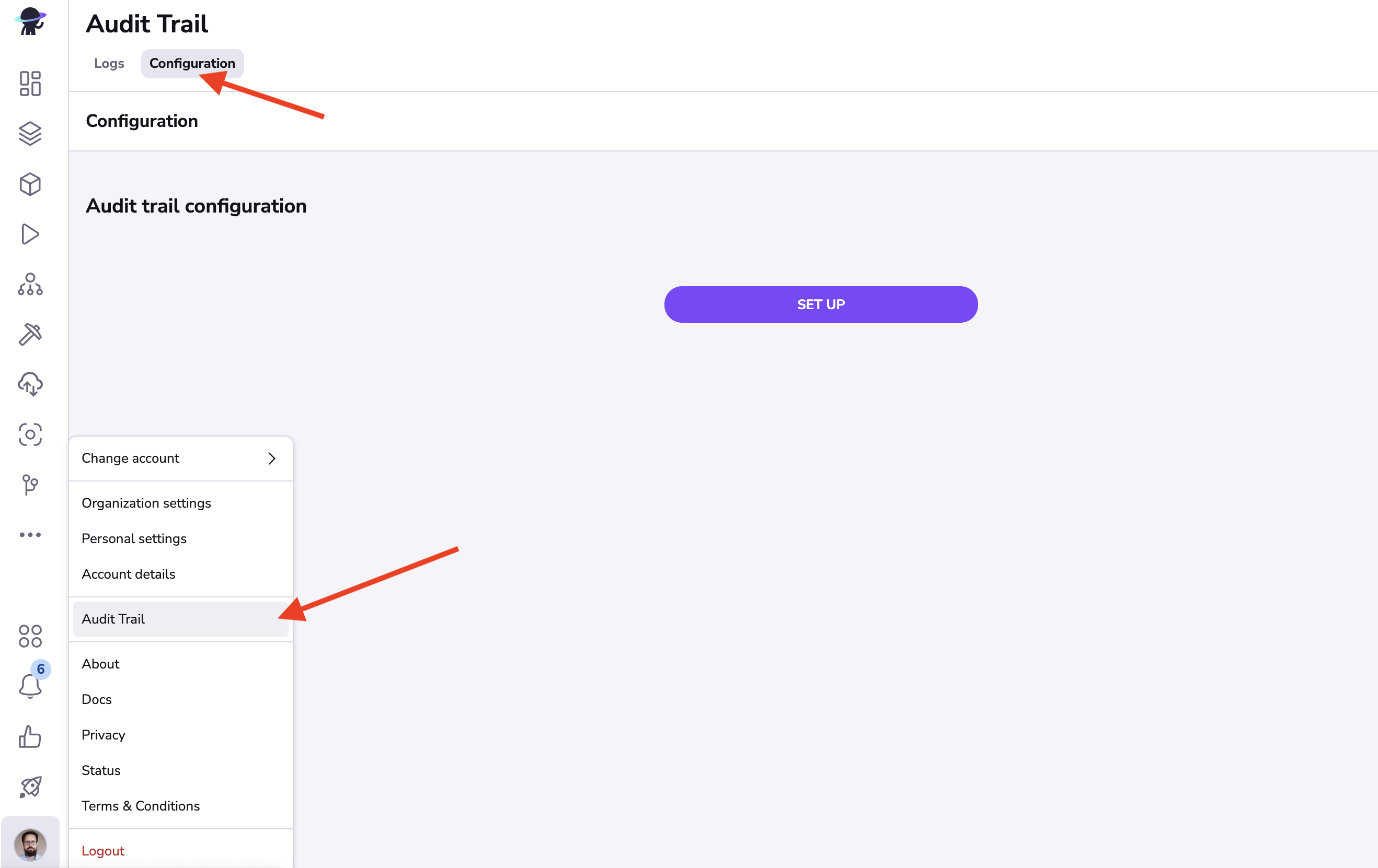 In order to set up webhooks for audit events, navigate to the Audit trail section of your account settings and choosing the configuration tab, and click the Set up button:
