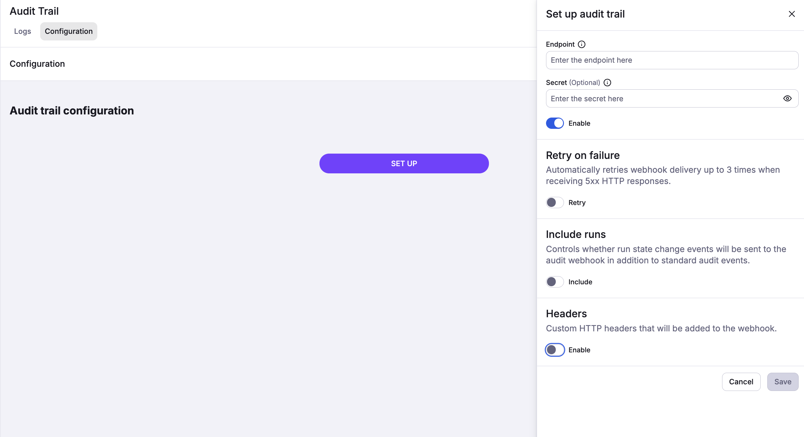 Optionally you can specify the custom headers that will be added to each HTTP request and enable Include runs option, which controls whether run state change events will be sent to the audit webhook in addition to standard audit events.