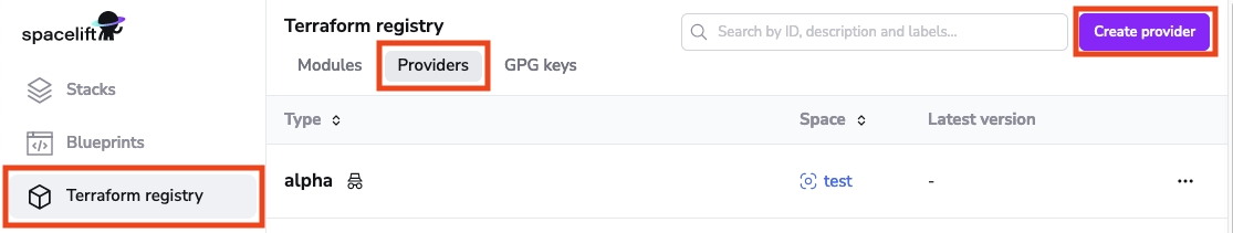 In order to create a provider in the UI, navigate to the Terraform registry section of the account view, switch to the Providers tab and click the Create provider button: