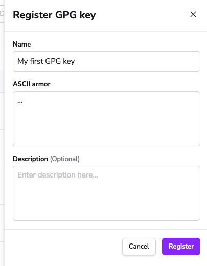In the Register GPG key drawer, you will need to provide the name, the ASCII-armored private key and optionally a description: