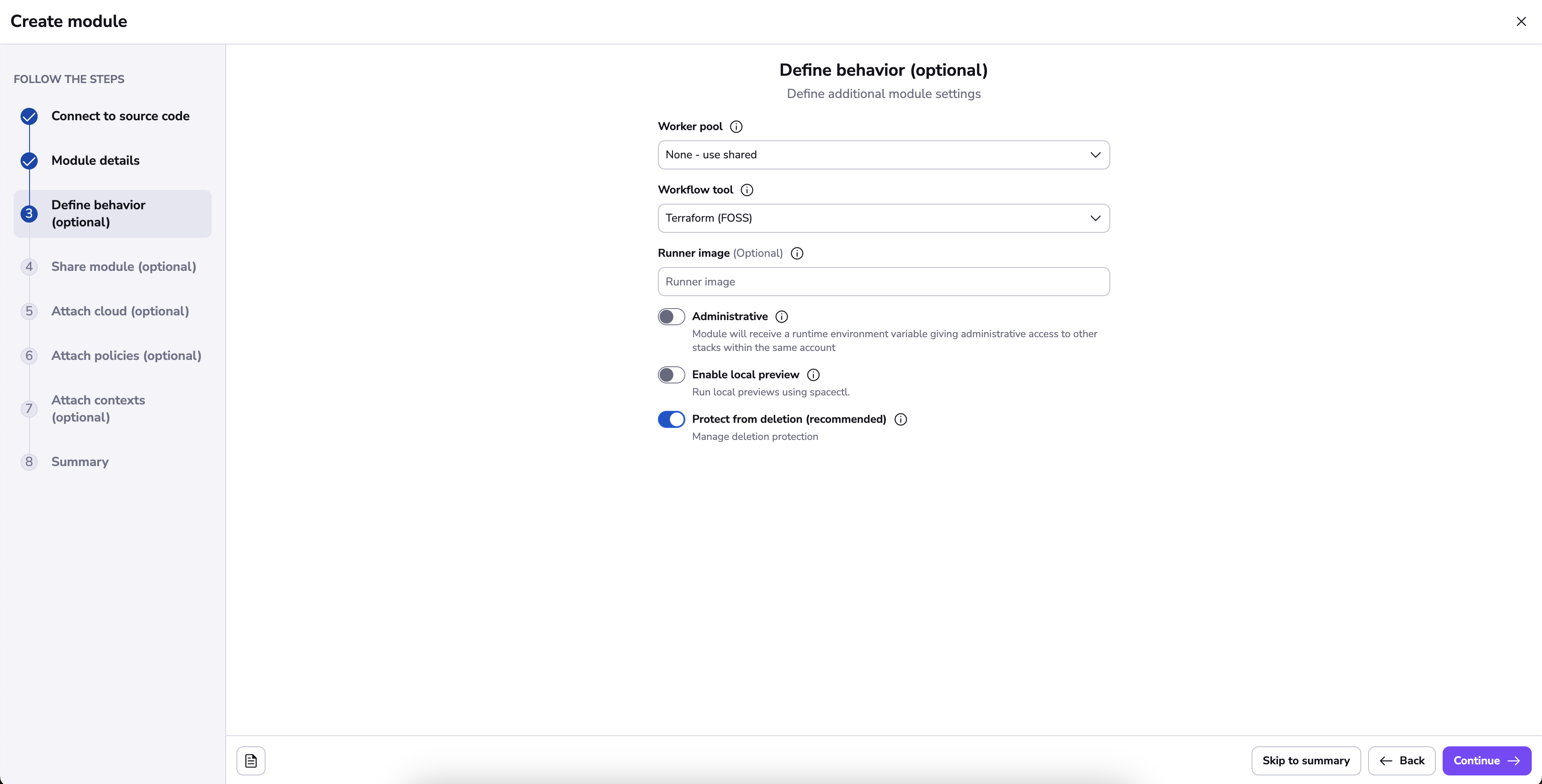 trueif your module manages Spacelift resources (and most likely it does not)), - whether or not to enable the local preview spacectl CLI feature;