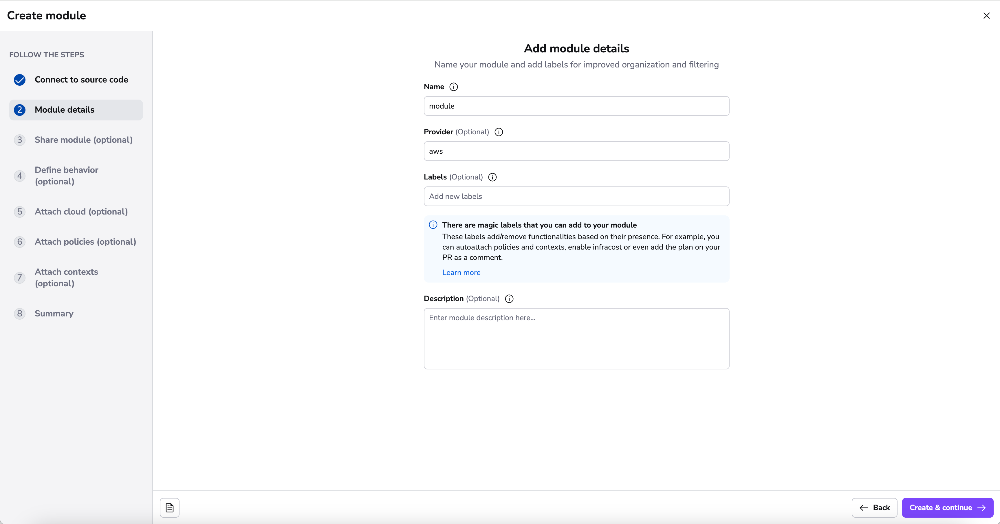 In the details section, you will be able to add a name, provider, labels and description.