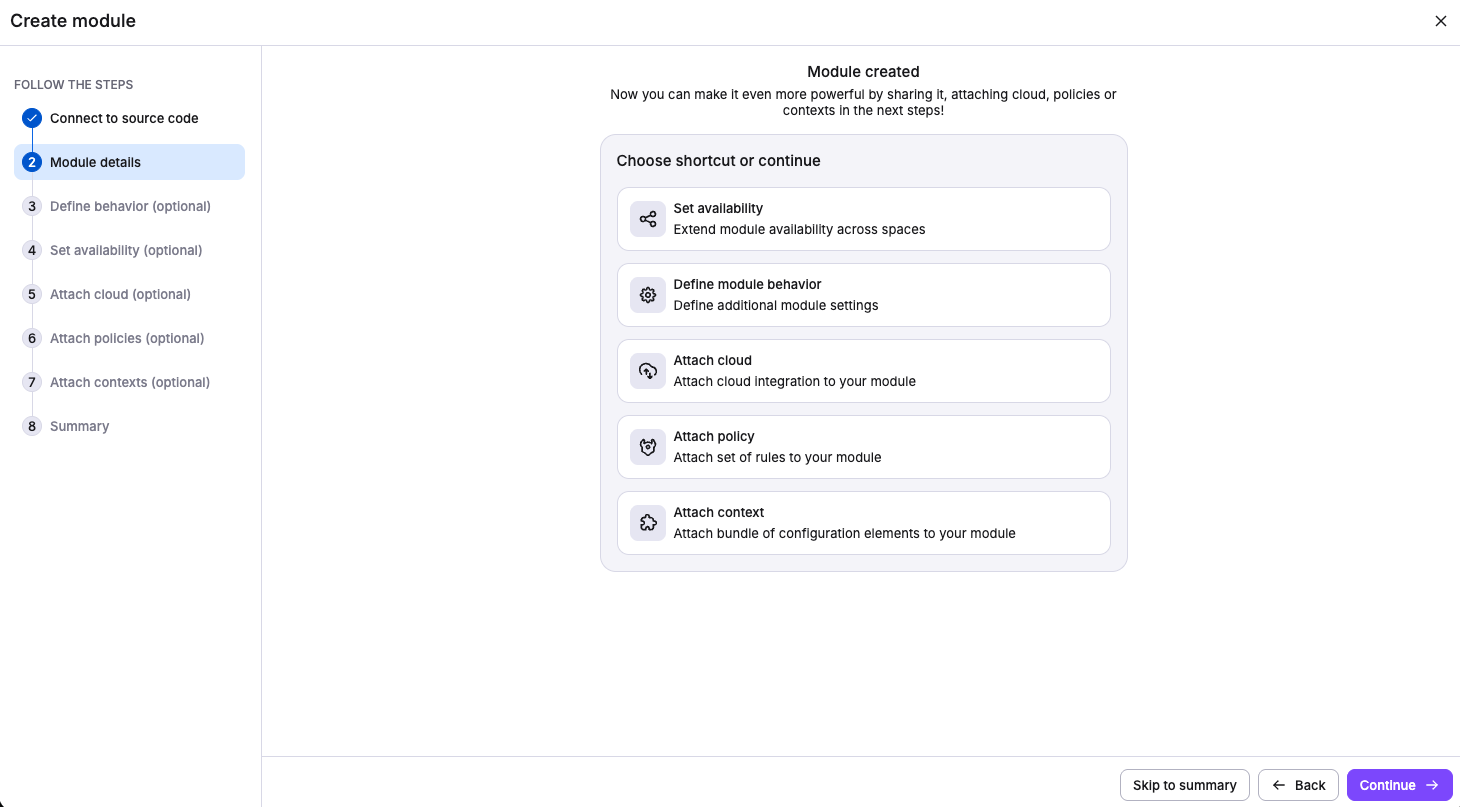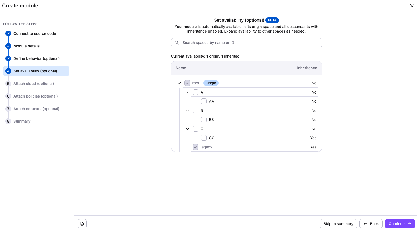 Modules become discoverable and usable by stacks in the selected spaces, while module management remains with the owner. Learn more about module availability.