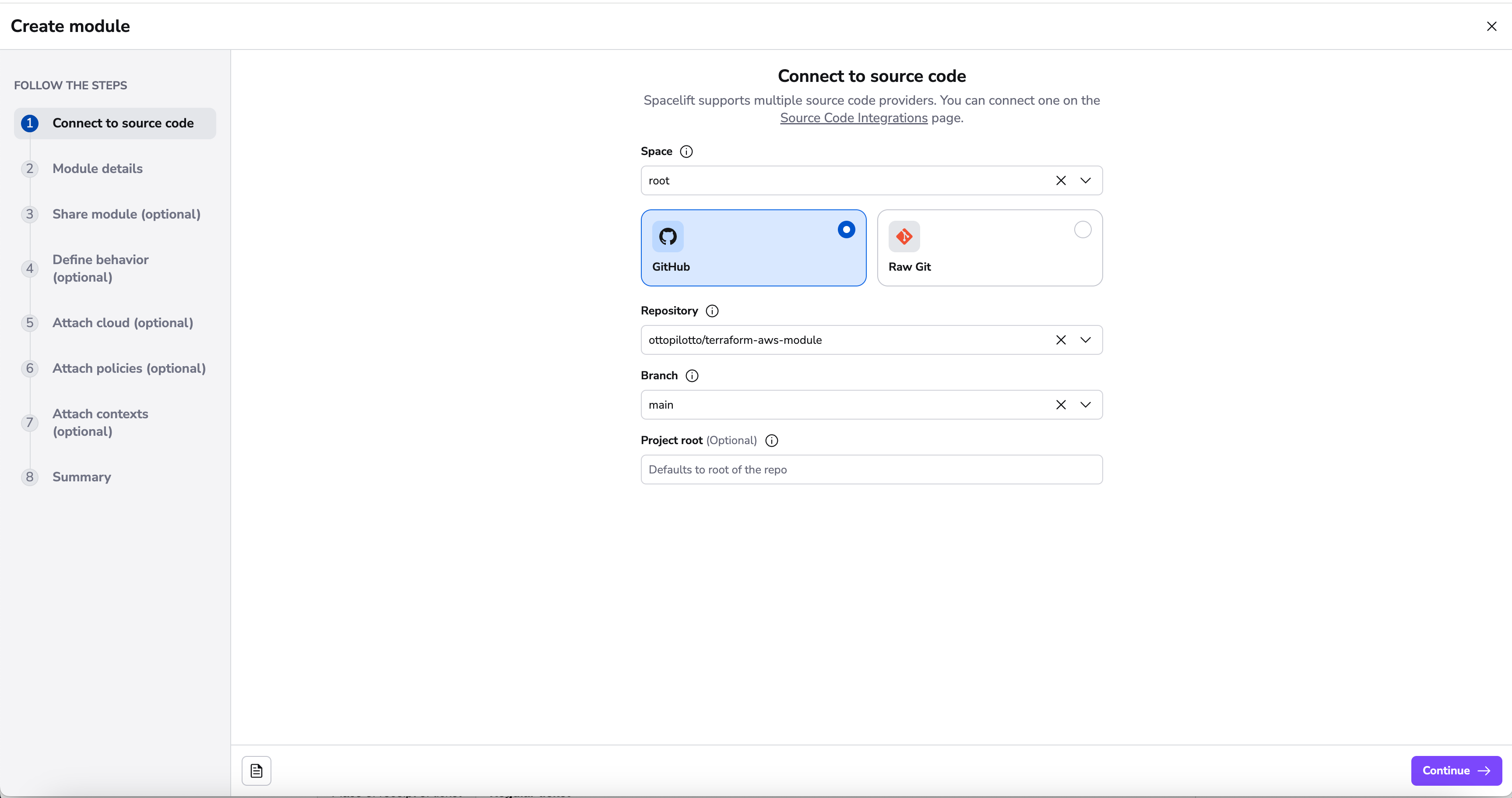 First, point Spacelift at the right repo and choose the "tracked" branch - note that repositories whose names don't follow the convention are filtered out: