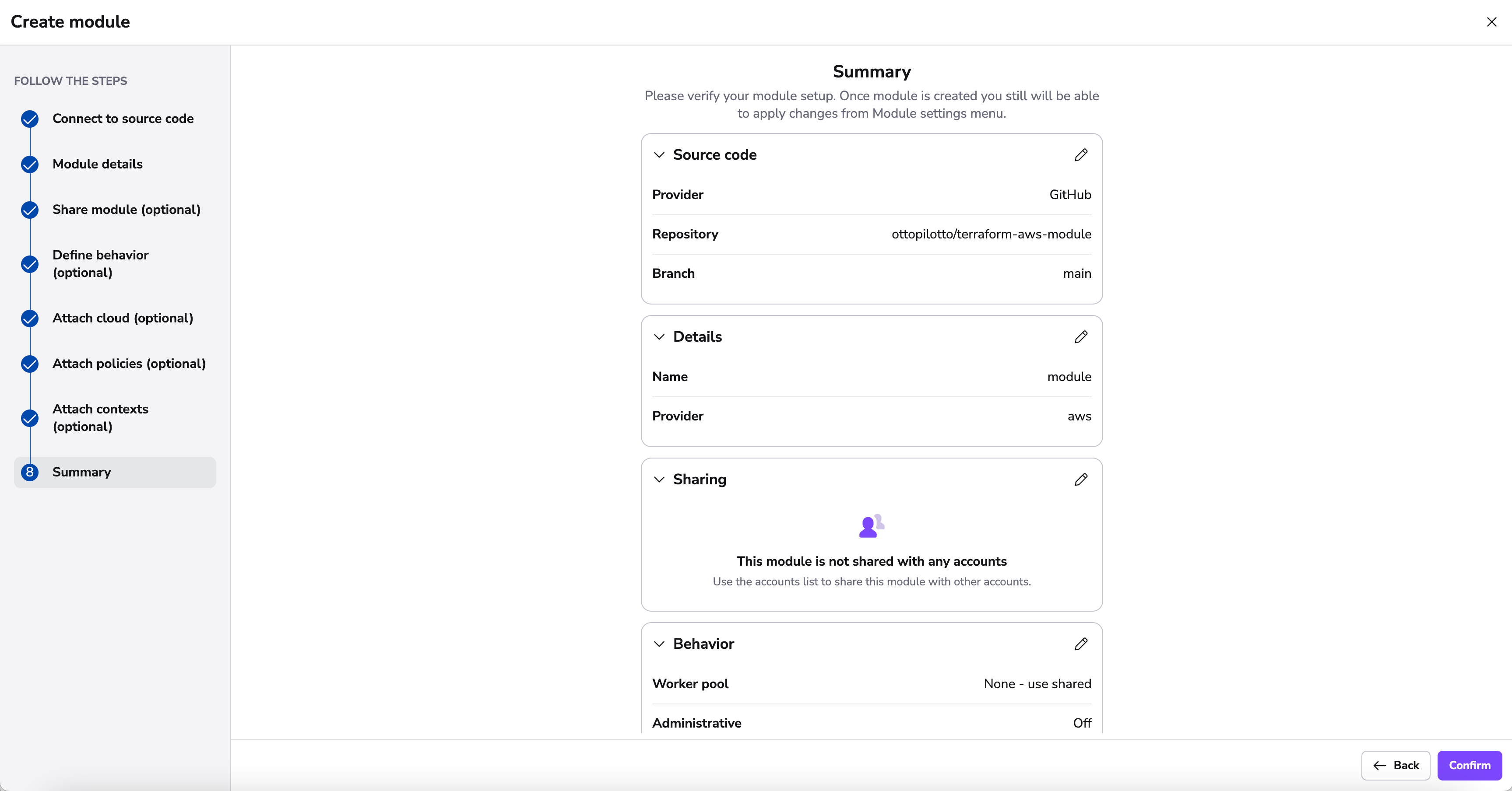 On the summary section, you can now review your settings before finalizing the creation of your module. This modular approach ensures your module gets set up with all the necessary components.