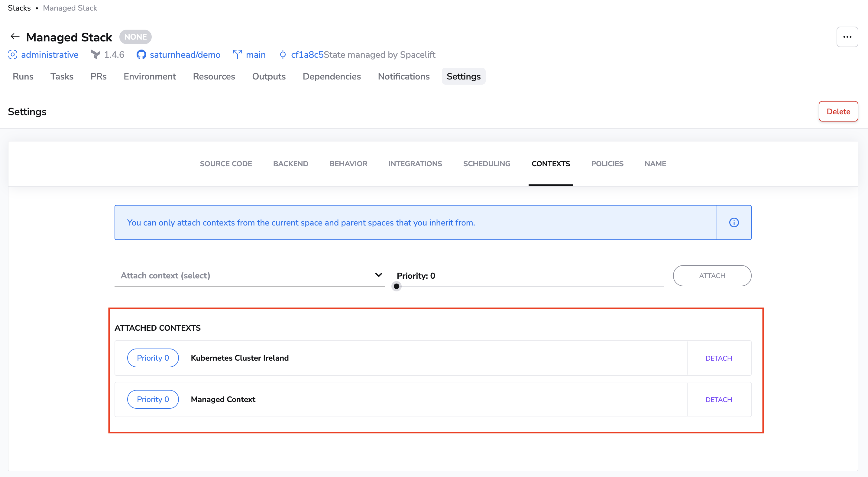 You can create, edit, attach, detach and delete contexts. We will show you how to do so through the Spacelift UI, but you can also manage contexts programmatically using our Terraform provider.