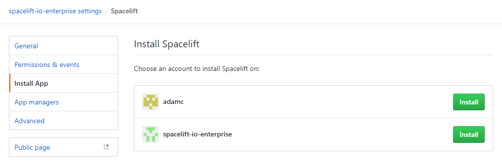 - In the Install App section, click Install next to the account you want Spacelift to access: