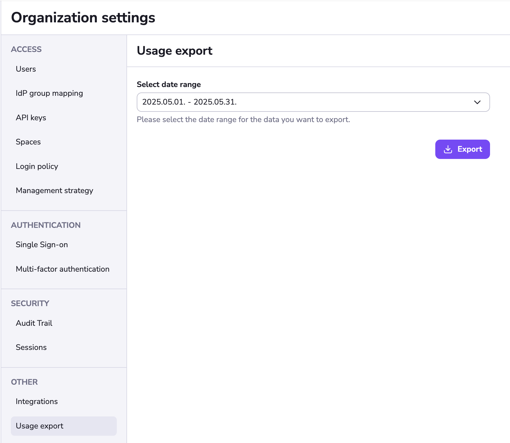 Navigate to Organization Settings in the Spacelift UI, select Usage Export from the left menu, choose the desired date range and click Export to download the report. Finally, share the file with your Spacelift contact.